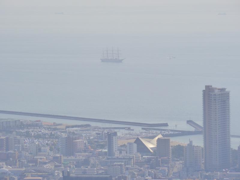 ゆっくり花を楽しんだあとは登山口へ。遠くはやや霞んでいるものの、晴れ渡った空と海が美しいです。神戸沖には、帆船『日本丸」が停泊しているのも確認できました。