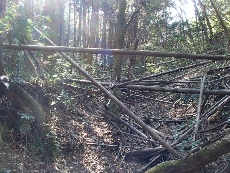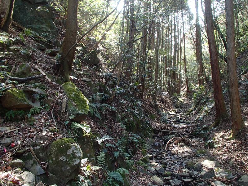 ・コースが枯れた沢に差し掛かると、倒木が多く非常に歩きにくい・・・。で、ここから目印が見つけにくくなっていきます。GPSで四石山を表示するも「登山ルートはありません」とでる・・・。なんでやねん・・・。