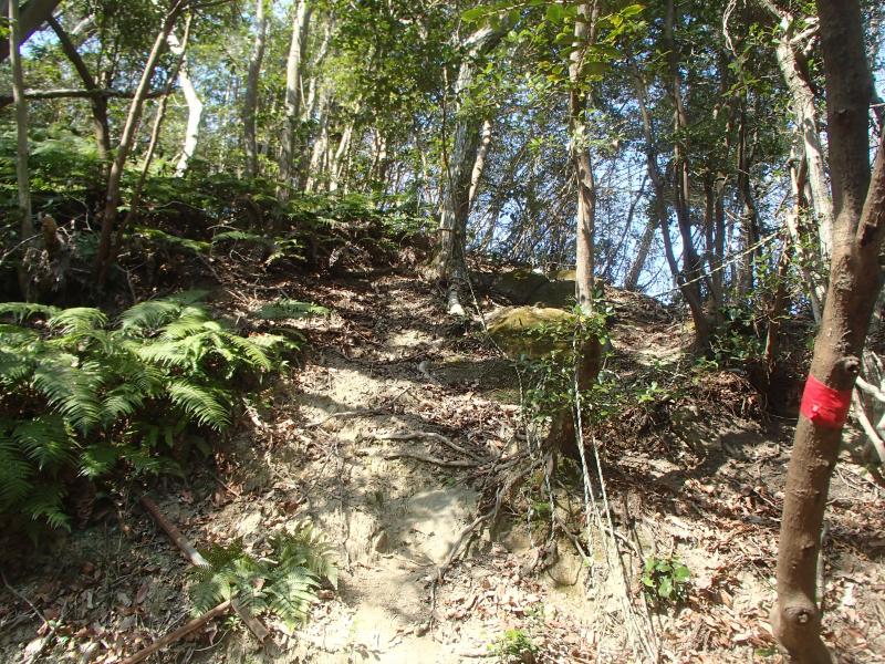 ・採石場から上部で再び赤テープと登山道標を発見し合流。ここから山頂までも結構分かりにくい感じの細い登山道です。目印を見落とさないように気を付けてください。