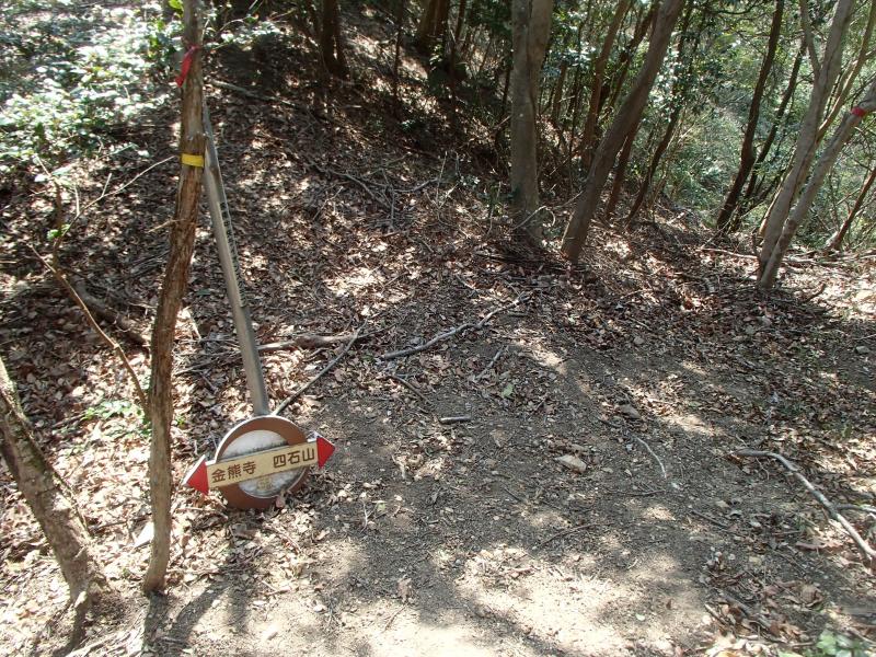 ・目印を見つけた後も、歩きやすいとは言いかねるコースが続きます。細く、くねくねと木々の間をすり抜ける感じの道です。すると前方に「金熊寺⇔四石山」の道標が。どうやらこのコースはちゃんとしたルートのようですが、どこからがルートだったのかは不明。これはリベンジしないといけないですね・・・。
