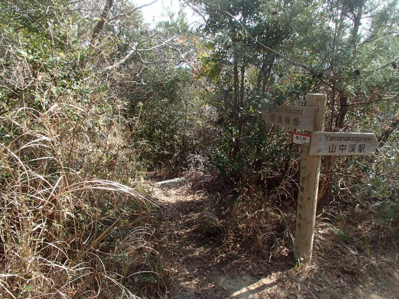 ・少し開けた小さなスペースが見えたので足早に向かうと山頂でした。山頂から展望はあまりありません。3コースの合流点になっています。少し休憩して下山を開始。
