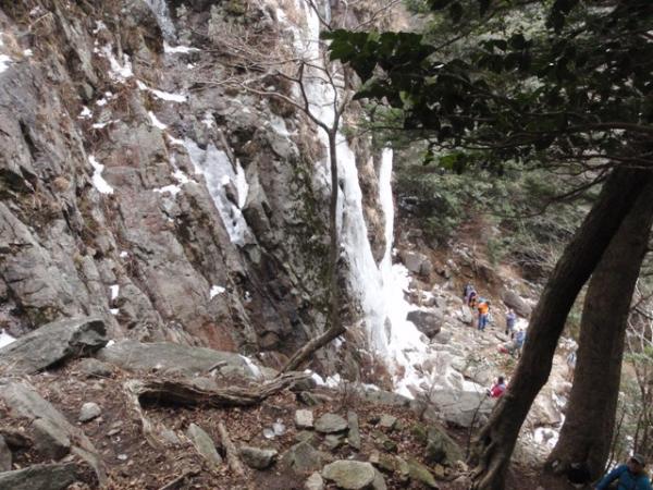 - ツララまでの登山道は雪は付いてなく歩きやすかったです。ツララへ近付くと解けた雪が凍ってツルツルしてるのでアイゼンは必須です。ツララの下は特にツルツルします。少し暖かくなるとツララが落ちてくる事があるので近付きすぎずに眺めるのをおすすめします。登山道が狭いので、譲り合って通ってください。