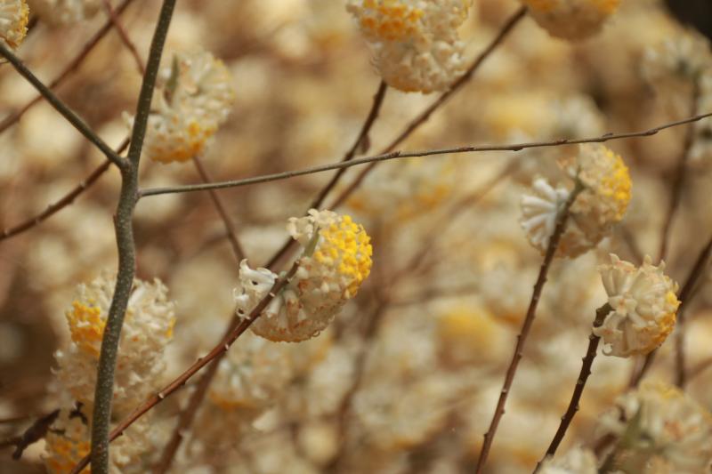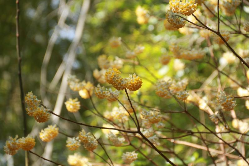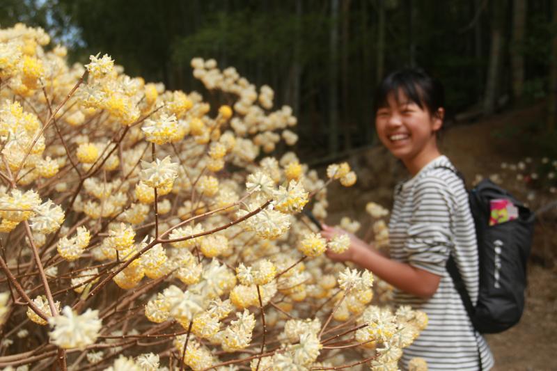 「和紙」の原料の花です。三月から四月に花を咲かせます。三つの枝の先に花を咲かせ香りもよく満開のミツマタに出会えた皆笑顔です。