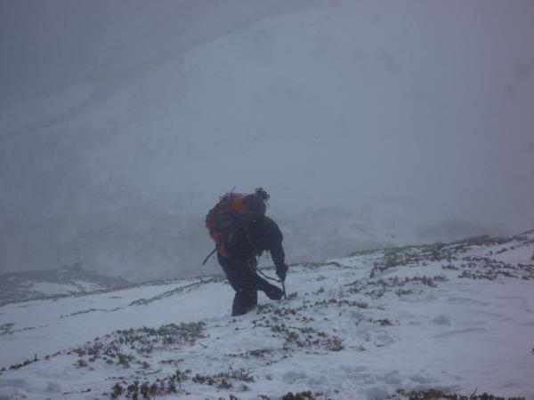 山行自体はロープウェイ利用の「日帰り」です。菅の台バスセンターからロープウェイ駅のしらび平までは路線バスで。約35分の乗車です。さらに高低差950m(日本最高)、終点の千畳敷駅の標高2611.5m(これまた日本最高)まで運んでくれる駒ヶ岳ロープウェイで一気に!!こんな高所登山が日帰りでできる素敵な山なんです。千畳敷からは広大な千畳敷カール。その先には超鋭鋒『宝剣岳』が望めます。夏なら宝剣岳を左前に見ながらカールの底へ下りていくのですが、ここは雪崩の巣!冬期は通行禁止です。カールの底からは…。先行者が右の和合山への直登ルートを選んでおり、ラッセルが激しそうなので我々はそのルートを利用させてもらいましたが、20名ほどの団体はカール右側の夏道を行きました。先頭のガイドさん(?)はスノーシューを履いており、後続はそのトレースを進んでいました。我々もカール底部からスノーシューへ履き替えましょう♪途中から一気に高度が上がり、さらに天候も急変しました。宝剣岳も霞み始め、風も強く、指先の感覚を奪います!息は上がり、サングラスの内側も凍り始め、気持ちが萎えそうになる頃稜線へ到着。ここからは休憩できる場所はありません!宝剣山荘前で軽く食事を取り、中岳で荷物をデポ(荷物を置いて)して木曽駒ヶ岳へ向いました。ふうぅー、ロープなどのクライミングギアが重かった…。