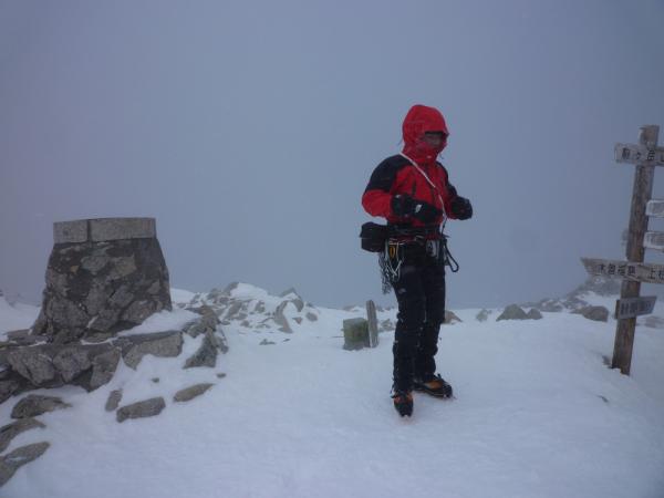 明星は6度目の登頂にもかかわらず、寒さ対策をやや失敗しました。インナーグローブが薄く、このまま数時間居れば凍傷になるんじゃないかと思ったくらいです。3000mクラスのアルプスですから風が強いことは言わずもがな。また、登りではスノーシューが威力を発揮した一方、飯沼さんのわかんは苦しそうでした。やはりスノーシューのグリップ力には敵わず、見る見るうちに差が広がっていきました。彼が登山レポートで言っているように「アイゼン歩行」がよかったのかな…(-_-)。