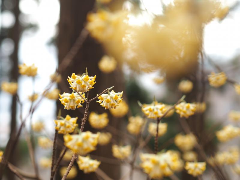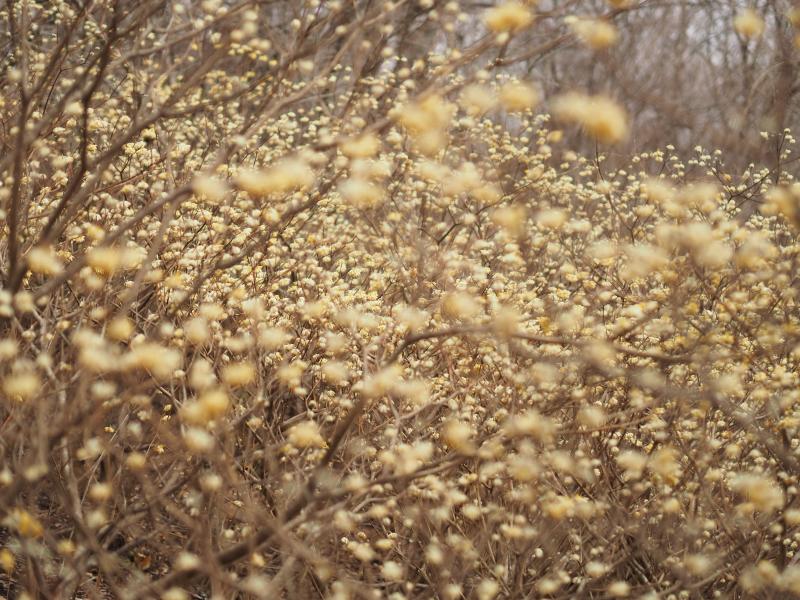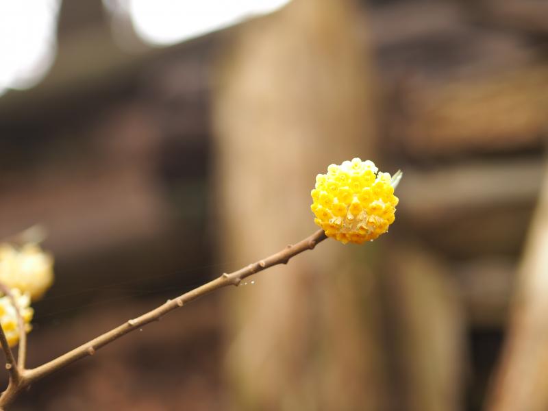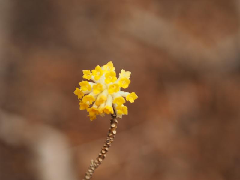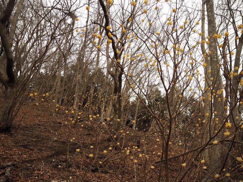 そこには所々ミツマタが咲いていました。いや、咲き始めていました、というところでしょうか。ぽつりぽつりと咲いているミツマタにカメラを向けつつ1時間ほどで山頂に到着。山頂少し手前からミツマタの群生が始まります。きたきたーーって感じですがまぁ3~4分咲きといったところでしょうか。