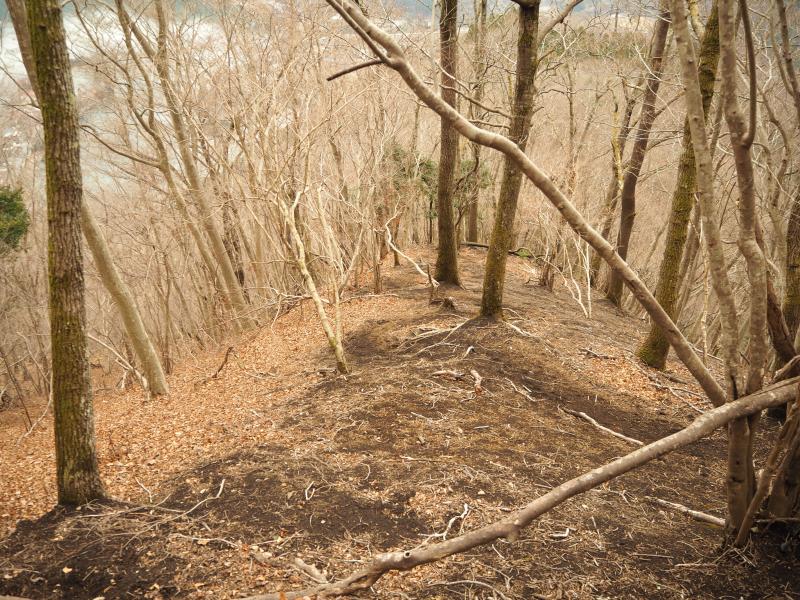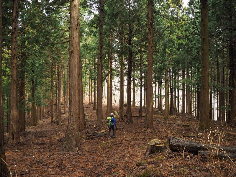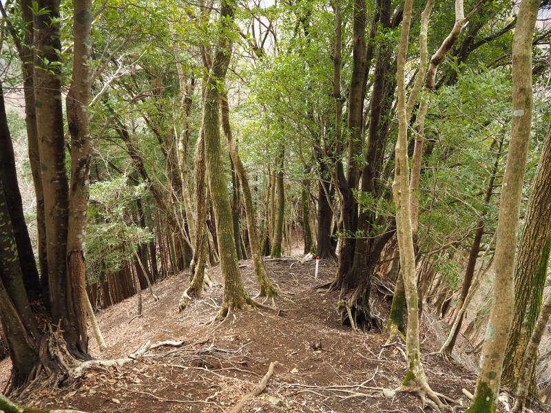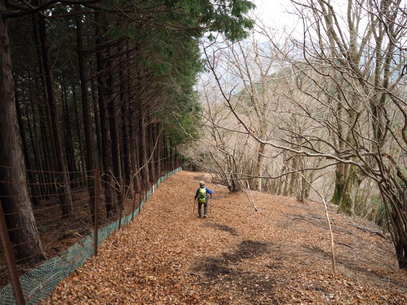 権現山からの下りはかなりの急坂。情報では不明瞭で初心者不向き、とはなっていましたが道標もあり注意して見ていればテープもわかります。いまはまだ木々の葉が生い茂ってはいないので見通しもいいです。でも足場は悪い急な坂の登山道。とても滑りやすくストックを使って慎重に下ります。下山口へと出る直前でまたミツマタの群生を発生。最後に撮り納め(笑)