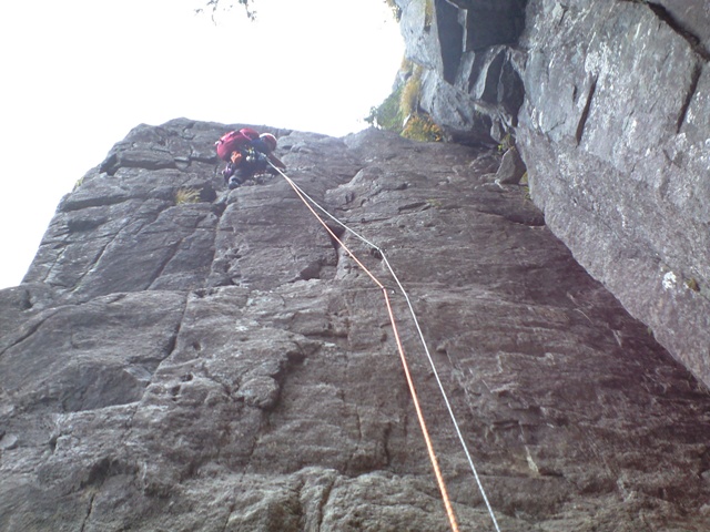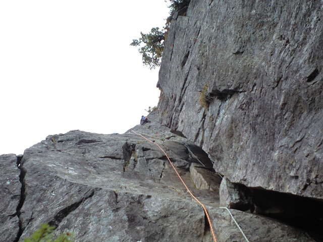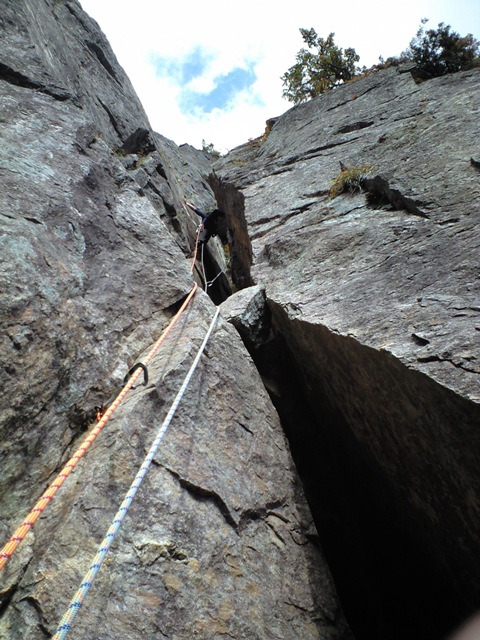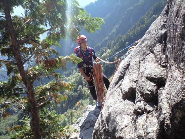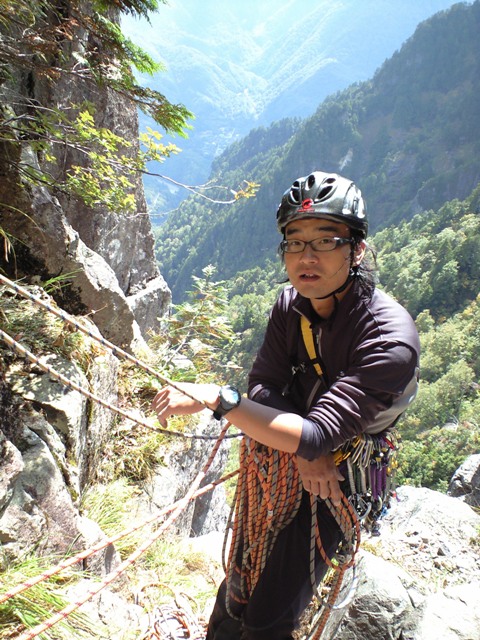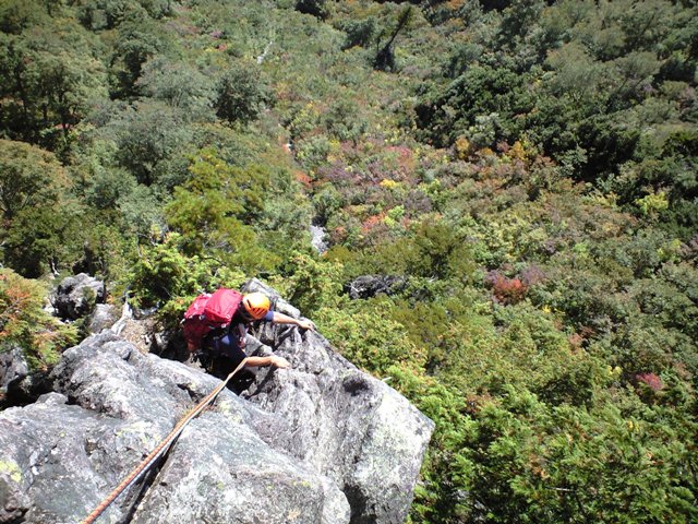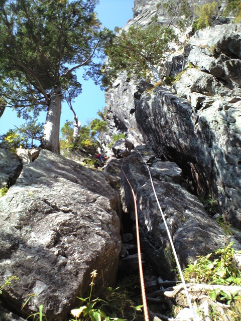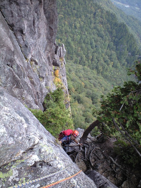 思い立って行く事になった「左方カンテ」。色々調べてみると、「どうやらルートが整備されてピン・ハーケンなどは無いらしい」との情報が・・・。まぁ、なんとかなるだろうと思い、当日を迎えました。実際、カムを噛まして登るのには、ビビリも入りましたが、登り応えは有りました。14:00をリミットとしトライしましたが、ゆっくりすぎて7P目で時間切れとなりました。ガイド本によると「同ルートを下降」とあったので、それにならいラッペル開始。かなり各Pでロープの回収時の引っ掛かりがあり、一箇所完全に引っ掛かり、登り返すハメになりました。(城戸君ご苦労さまです。)クラックやチムニーや木の根があるルートの下降時は、気を付けなければならないですね。うーん、しょっぱい登攀になりました・・・。