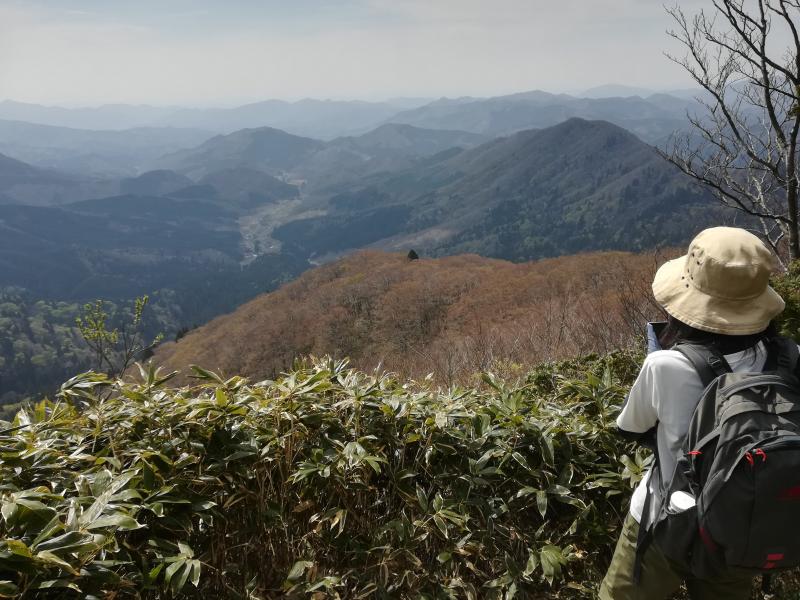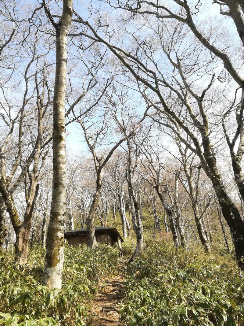 その後は新緑にはまだ早い落葉広葉樹林の森をひたすら歩いて、毛無山山頂に到着。