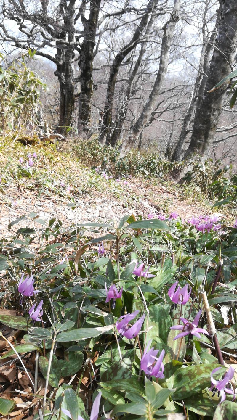先週の船通山のカタクリも良かったですが、毛無山は白馬山までの縦走路はいたるところに群生していて、規模の上ではこちらが上です。