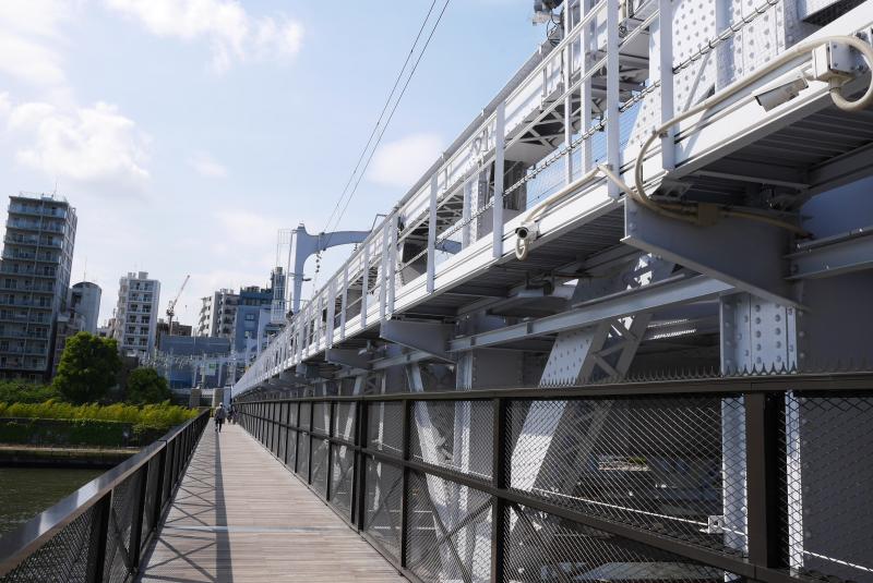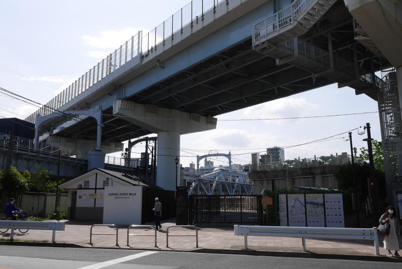 そのまま直進したところには墨田公園があり、右手に進めば牛嶋神社です。今年は丑年で人気みたいです。墨田公園を抜けて横断歩道を渡ったところにゲートのようなものがありますが、ここが墨田リバーウォークの入口です。以前はぐるっと回っていかないと浅草まで行くことができませんでしたが、東武鉄道の線路の横に橋ができて墨田公園から直進すれば浅草に着きます。ごとごと通り過ぎる電車の横を歩くのはなかなか楽しい体験です。