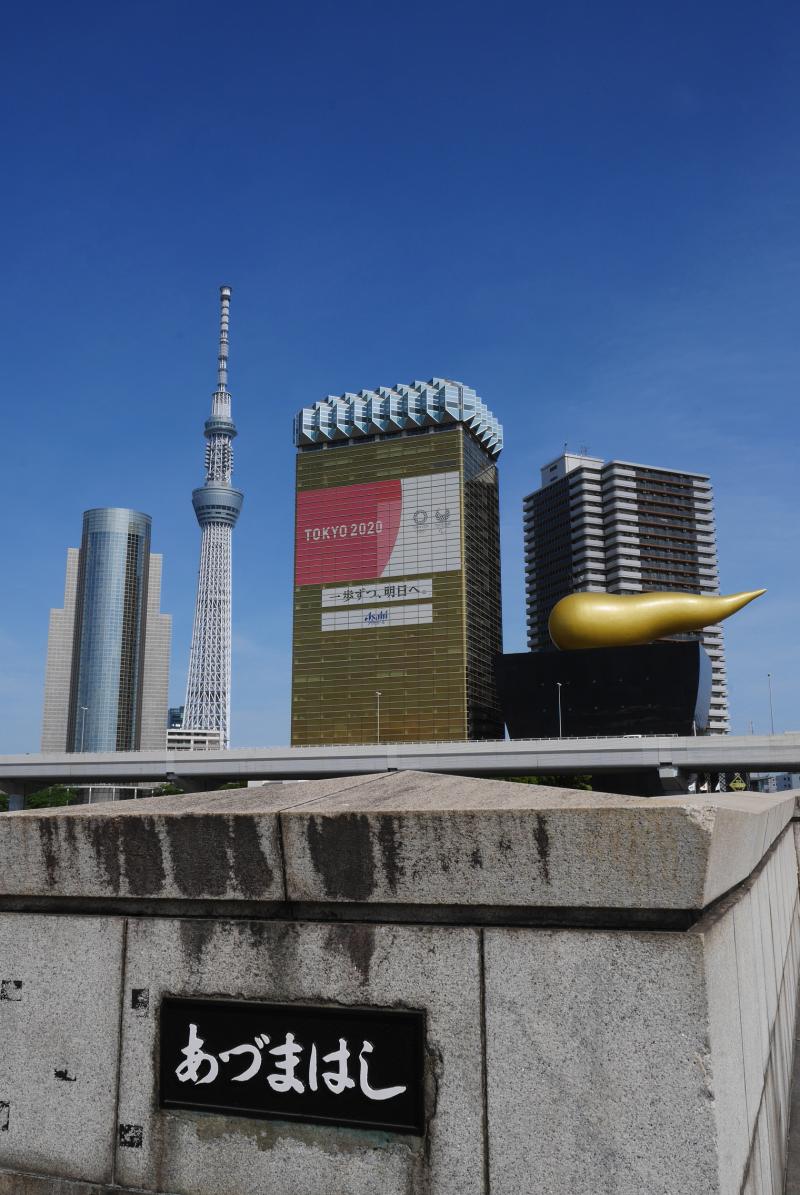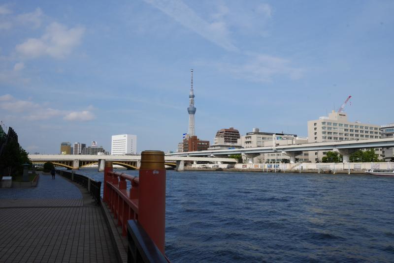 リバーウォークを過ぎて左手に向かうとすぐに見えるのが吾妻橋です。赤く印象的な吾妻橋の袂は、スカイツリーと墨田区役所、アサヒビールのビルがちょうど一緒に撮影できるポイントになっています。