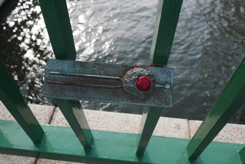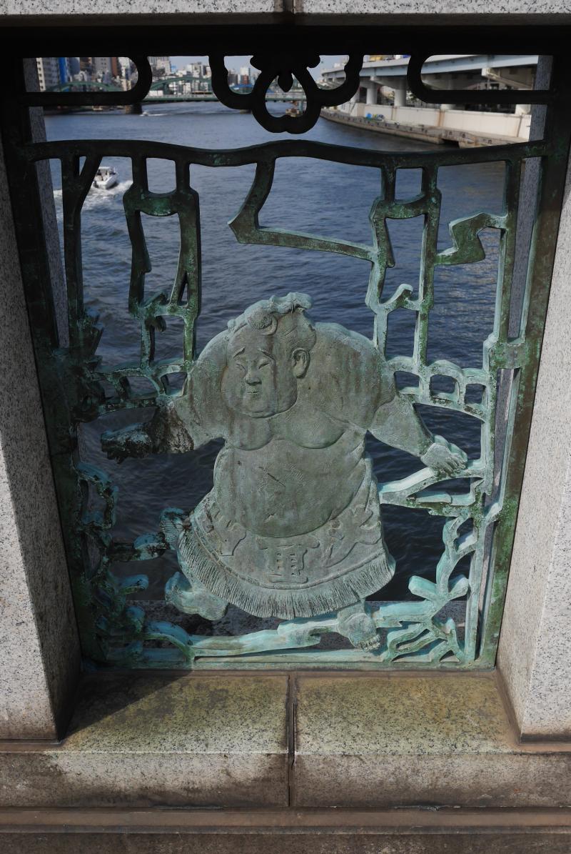 橋を渡って左手の階段を下りると川の横が歩道(隅田川テラスというらしい)になっているので両国方面に向かって歩きます。駒形橋、厩橋を通り過ぎて出てくるのが蔵前橋。ここで向こう側に渡るために橋の上まで出ると、おもしろいものが目に入ってきたので橋の装飾をよく見ると、相撲の力士になっていました。わたしも最近知ったのですが、蔵前は両国国技館ができる前の1984年まで30年間、蔵前国技館があった場所だそうです。跡地はいま水道局になっています。