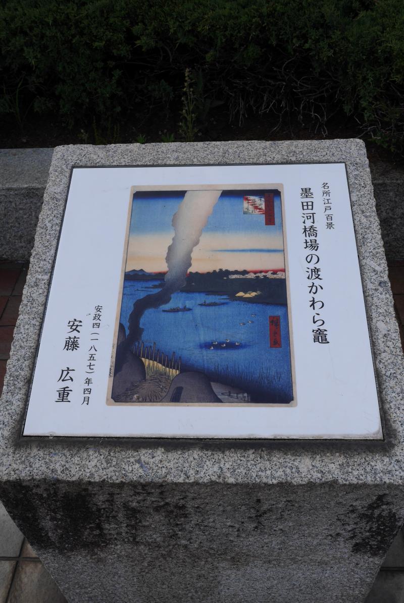橋を渡ってまた隅田川テラスへおりると、なまこ壁風の堤防があり大名の家紋が埋め込まれていたり、広重の名所江戸百景の浮世絵のレプリカが見られたりと江戸を感じるコーナーになっていました。両国の花火大会や浅草の五重塔など、現存しているものはどこを描いているのかわかるのですが、ほとんどの作品がどこの場所を描いたものなのかわからなかったため、気になって後日調べてしまいました。特に文化や風習がいまは変化してしまったものはいったい何のシーンなのかわかりにくいので、いちいち調べる方が楽しめるかもしれません。調べて特に意外だったのは、隅田川にたくさんの船が出ている「浅草川大川端宮戸川」という浮世絵で、両国から大山詣りに行く人たちを描いているシーンだそうです。当時富士山と並んで人気だった大山(大山と富士山の御祭神は親子だから両詣りが流行したそうです)は、両国から船で2~3日で行けて箱根の関所も超えないので、江戸時代の手軽なレジャーだったそうです。今では簡単に日帰りハイキングできる丹沢の大山ですが、江戸時代はみんなで船で出かけるようなところだったのですね。