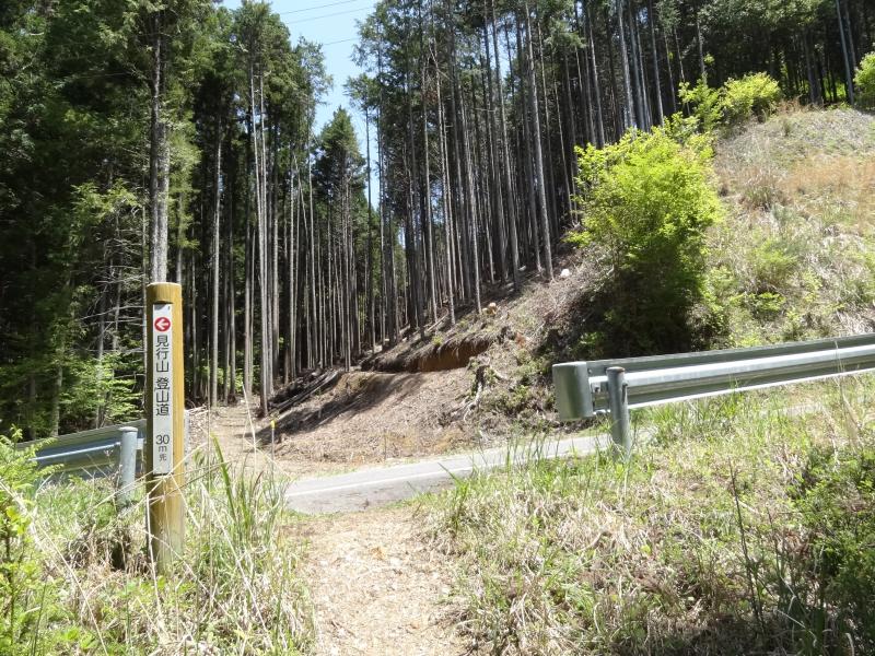 - 見行山登山口駐車場(8分)県道交差(23分)見行山(10分)祠(8分)丈右衛門新道分岐(15分)福地峠(35分)見行山登山口駐車場