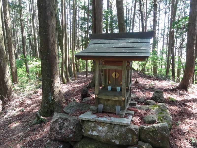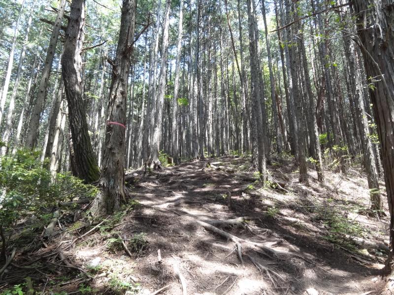 ➇山頂から丈右衛門新道方面は西側に下り、林道を越し、マーキングを辿って踏跡を下ります。尾根の一本道で祠から先は急な下りになります。
