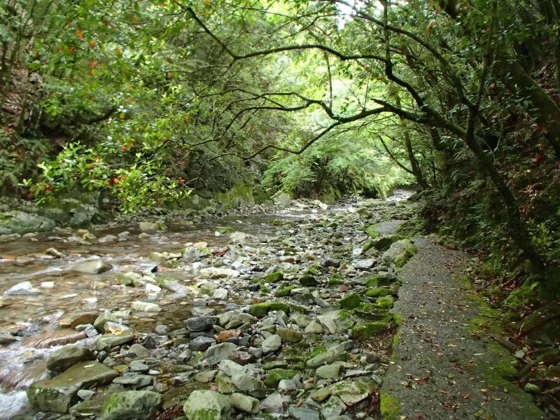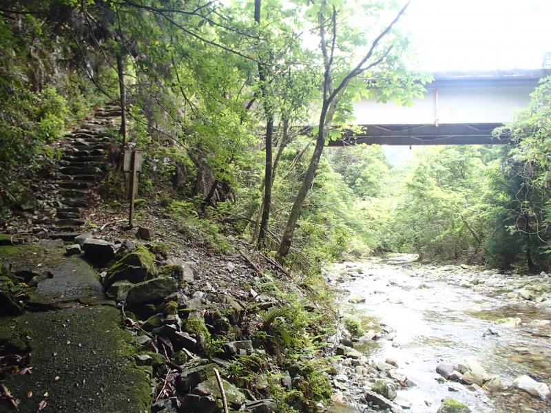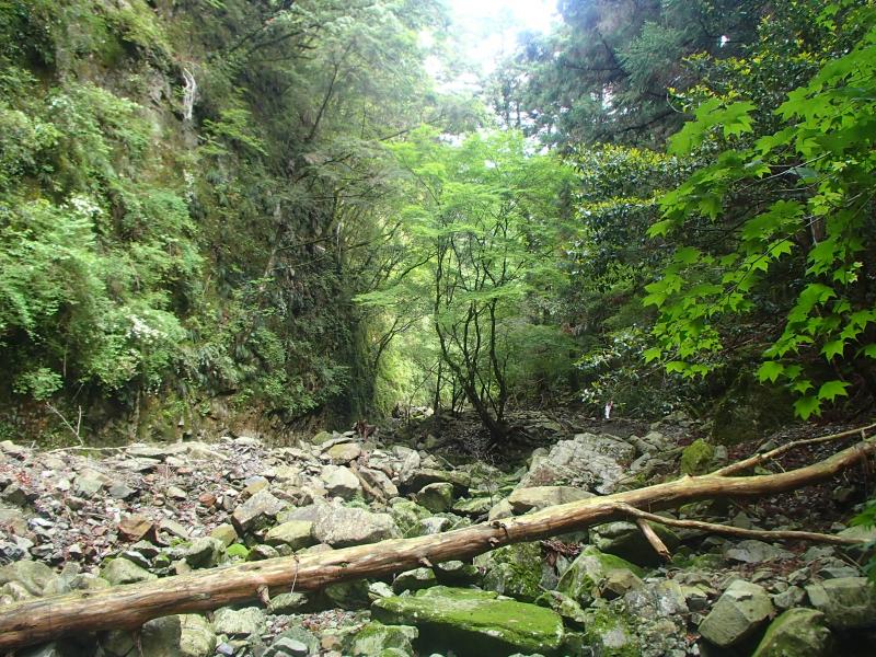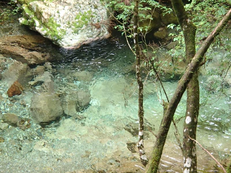 ・大塔橋の袂から沢に下りコンクリートでできた道を歩きます。しかし、沢の水がメチャクチャきれい!!平坦な沢沿いのコースを歩いていくと、地図にはない滝が左岸に出現。これは降雨状況によって出現したものなのかな?この滝の手前で最初の渡渉。増水気味なので飛び石で渡れるところを探すのにも一苦労です。