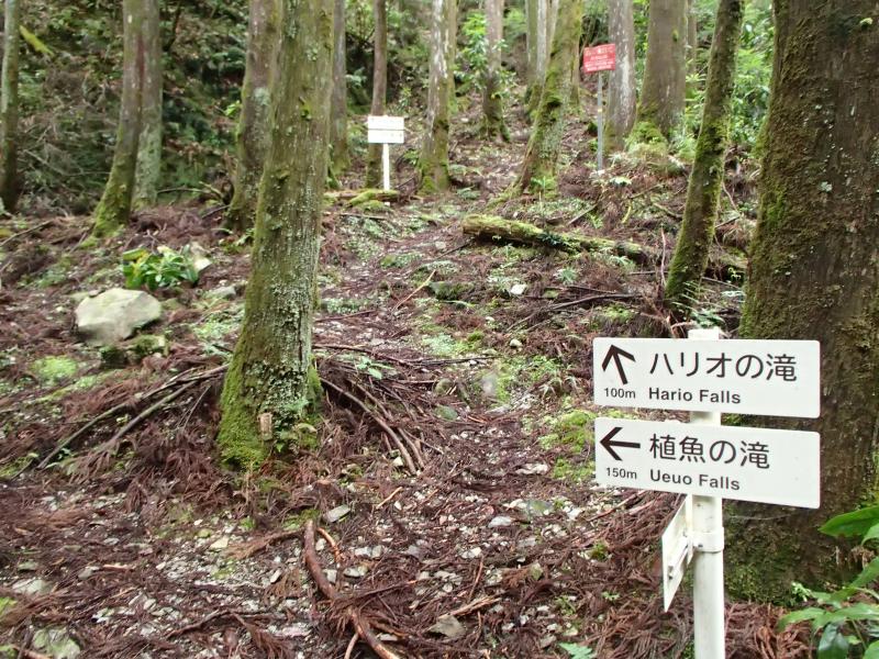 ・何度か渡渉を繰り返し、「植魚の滝 ハリオの滝」の道標に従って歩く事約20分。少し登った先に四辻が有りました。左に行けば植魚の滝、右に行けば張尾の滝です。まずは植魚の滝へ立ち寄ります。
