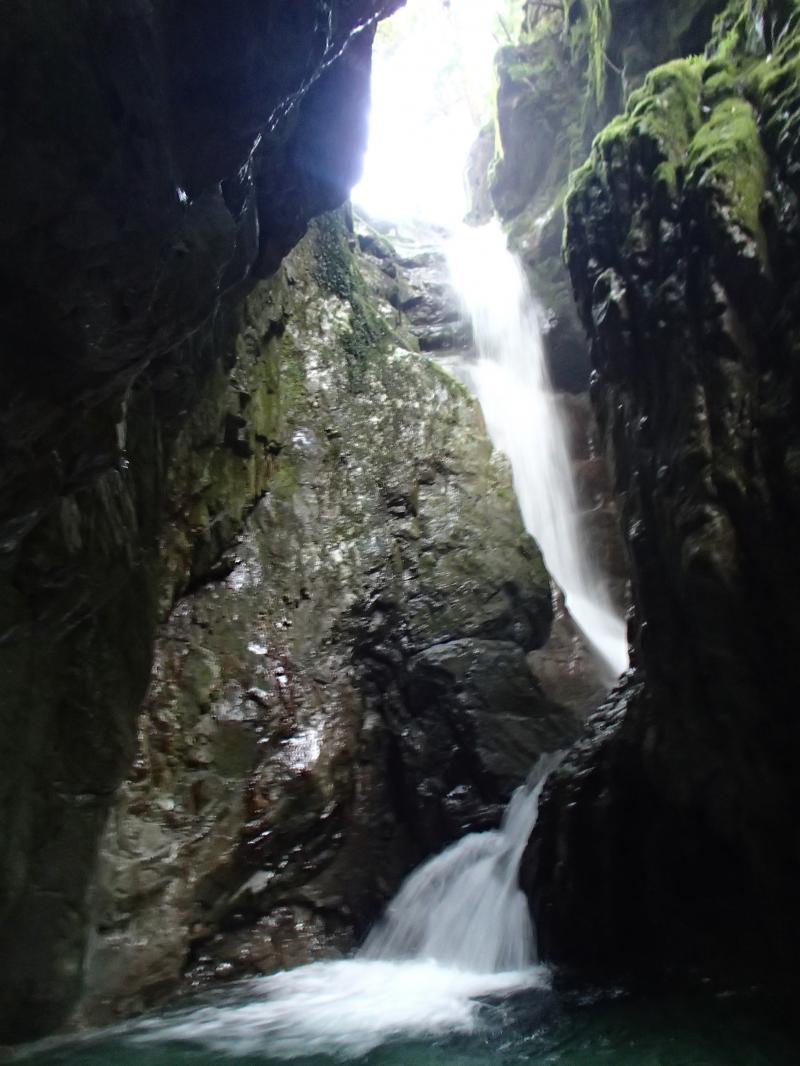 ・洞窟の中に流れ落ちる植魚の滝は迫力が有り、なかなか見栄えのする滝でした!でも、足が冷たいので長居も出来ず、写真を撮って引き返します。石の上に座って靴下をはいていると手の甲に異物感・・・。そう、ヤマビルです・・・。「のわぁ~!」と情けない声を出しながら岩に擦り付けて引きはがし何とかセーフ。よく見ると靴にもついとるがな・・・。ヒル除けスプレーを忘れてきた事に後悔しながらそそくさと滝を後にします。