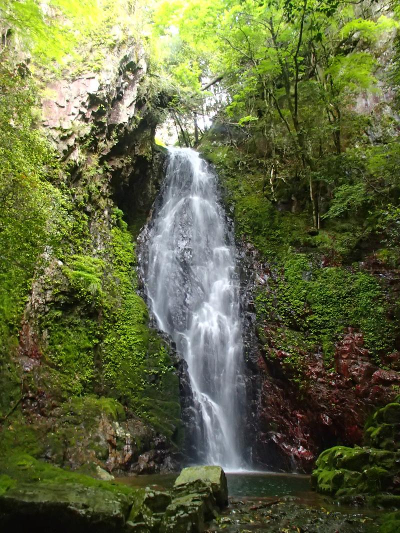 ・そのまま張尾の滝へ。こちらも趣は違いますが苔に覆われた岩肌と大きな釜が印象的な素晴らしい滝でした。こっちは登山靴のまま難なく見物できます。