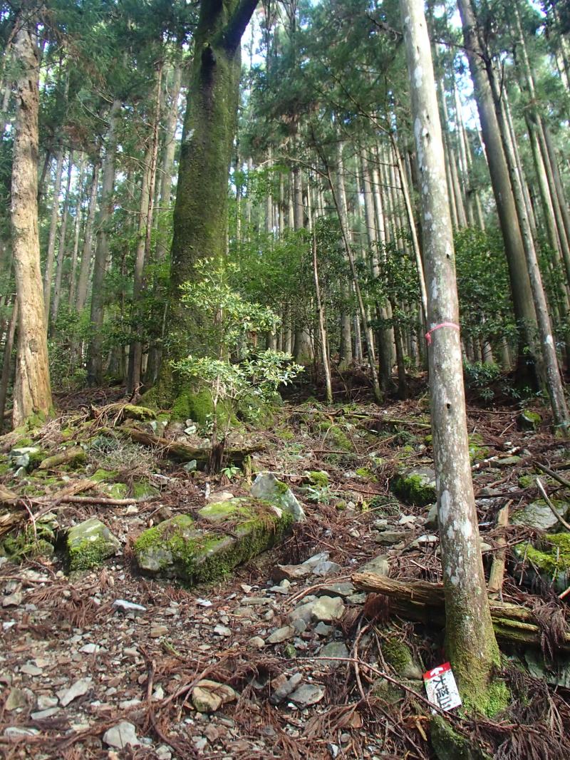 ・木の根元に「大塔山 2KM」の看板を発見。徐々に急になって行く登りを淡々と進んでいきますが、いきなり目印が無くなってしまいました。一旦戻って再度歩くもやはり同じ所で目印を見失う。左手にも歩ける道があるが倒木が有り、「行っちゃダメ!」の合図に見える。しばらく行ったり来たりするも、埒が明かないので、沢登りと同じ様に稜線目指して歩いてみることにしてみました。