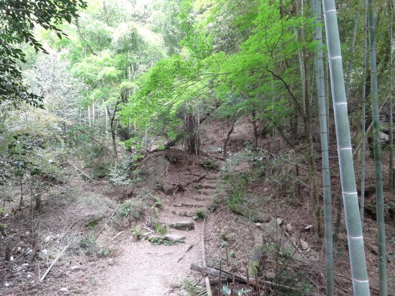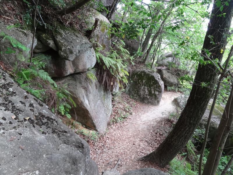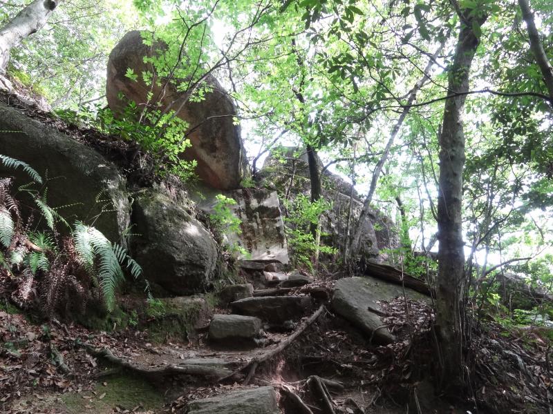 ③稲荷神社横から竹林を抜け、しばらく大岩を巻いていくような階段の登山道を進みます