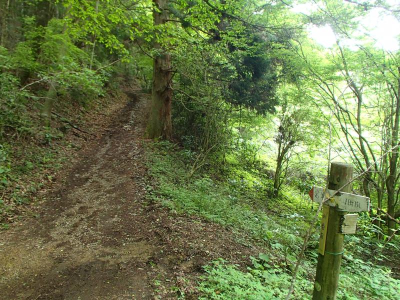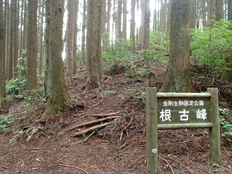 ・山頂でほんの一息ついてリスタート。少し下るとダイヤモンドトレイルに合流します。この合流点に立派な根古峰の指標が有ります。ここから南葛城山分岐まで延々林道のような平坦な道が続きます。