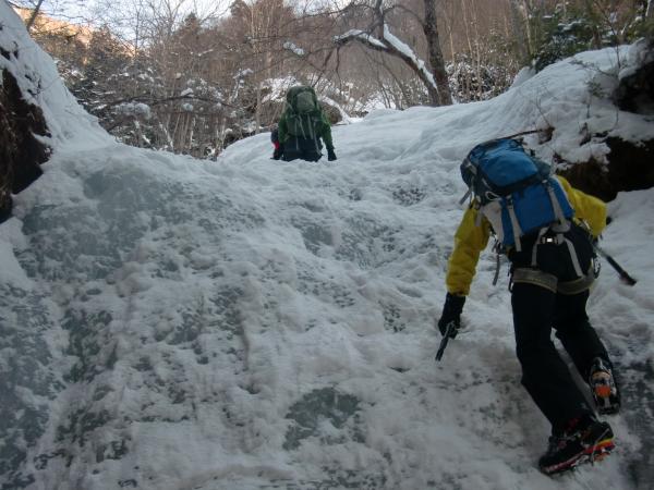 - 雪はそれほど多くないが滝はしっかり凍っている。氷を割ると水が噴出す場面も多々あり。
