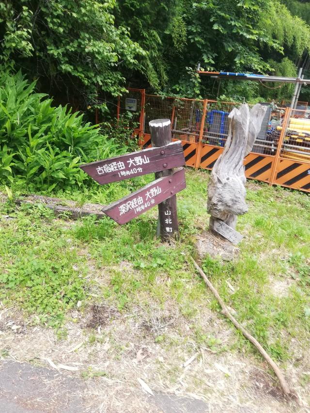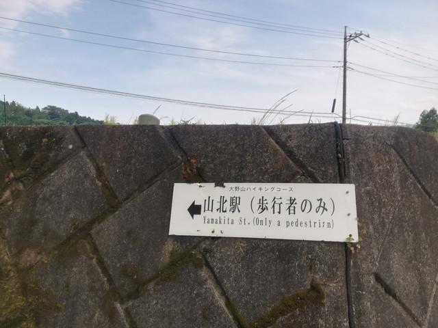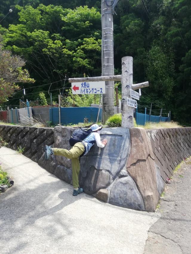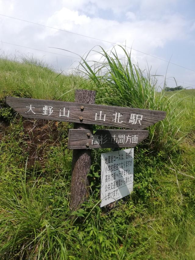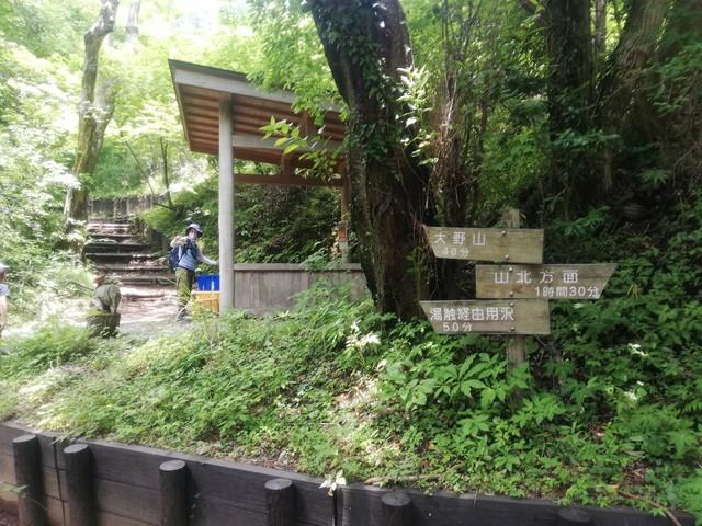 - 谷峨駅(10)看板のある橋(100)大野山山頂(60)登山道入り口(50)大野山入り口(20)山北駅