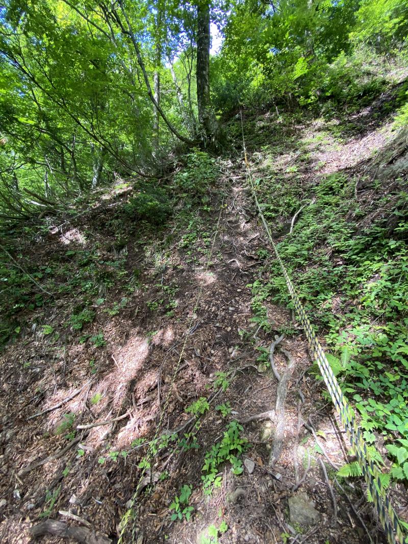 滝の音が近づいてくると、かなりの急斜面を下ります。