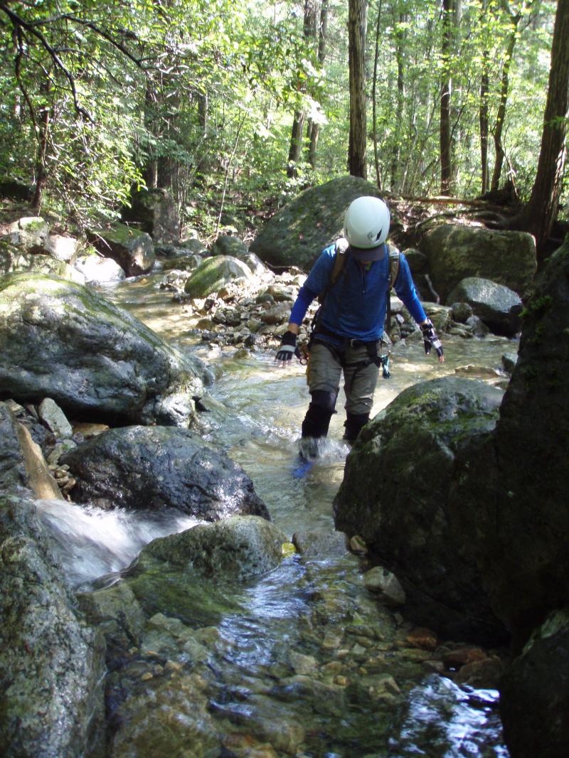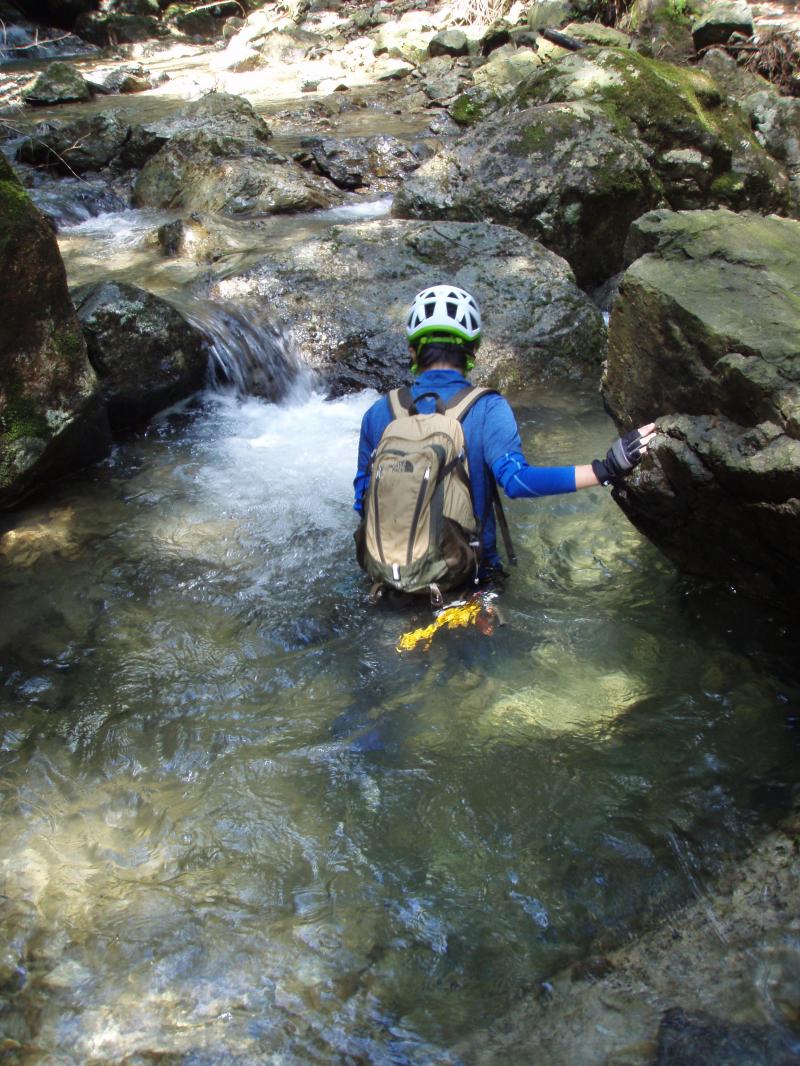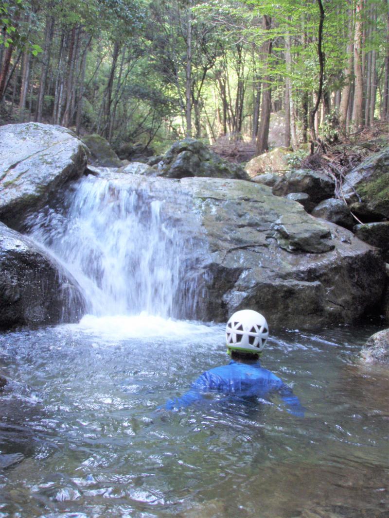 今回は初めて沢登りをするというアルバイトさんに、基礎的な技術を教えながら遡行しました。ここ数週間それなりに雨が降っていた為か水量は豊富で、腰ぐらいまで水に浸かる所もあり、非日常的な自然体験を楽しめました。基本的な移動のテクニックだけでなく、セルフビレイの取り方や懸垂下降などギアを使った訓練も実施。