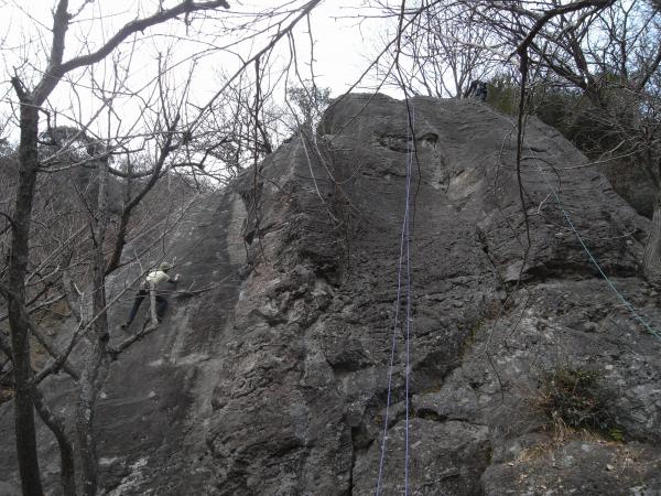 一段上のこのエリアにも多くのクライマーがおり、一番端の簡単なルートでウォーミングアップ。