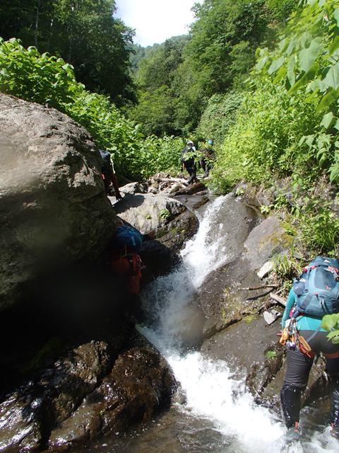 いつも一人だったり少人数で沢に行くことが多いのですがこの日は同じ山岳会のメンバー8人と一緒でワイワイと登りました。この日は帯広で35度にもなった猛暑日。まさに沢日和。沢は1000m過ぎで早々に涸れ沢となってしまい汗だくになりながら頂上にたどり着きました。