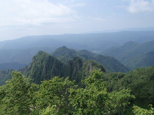 頂上からは噂に聞くギザギザ稜線と北日高の山並みを堪能。下りは東面の沢を下ると大きな滝もなく、簡単に下降する事ができました。