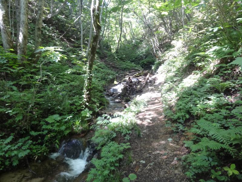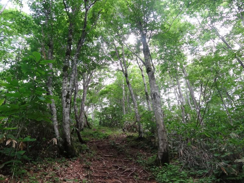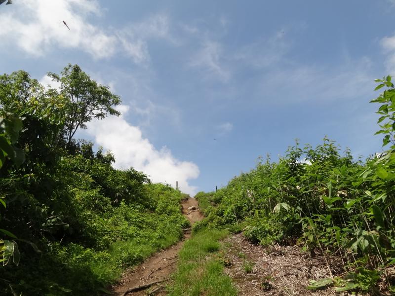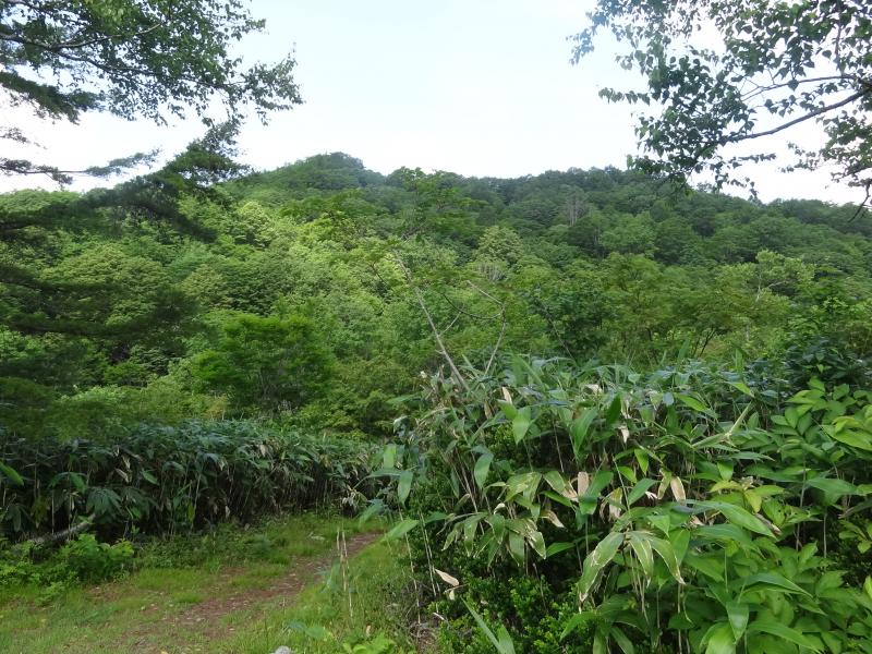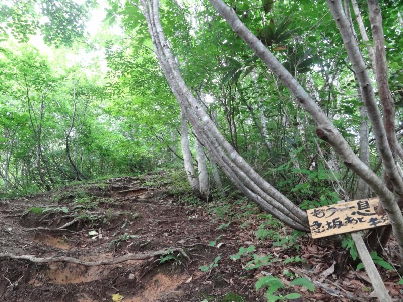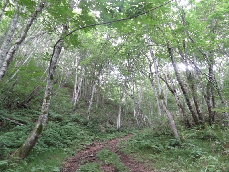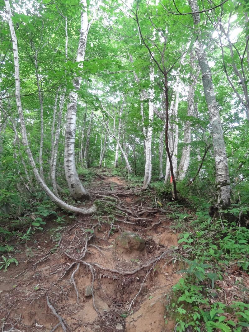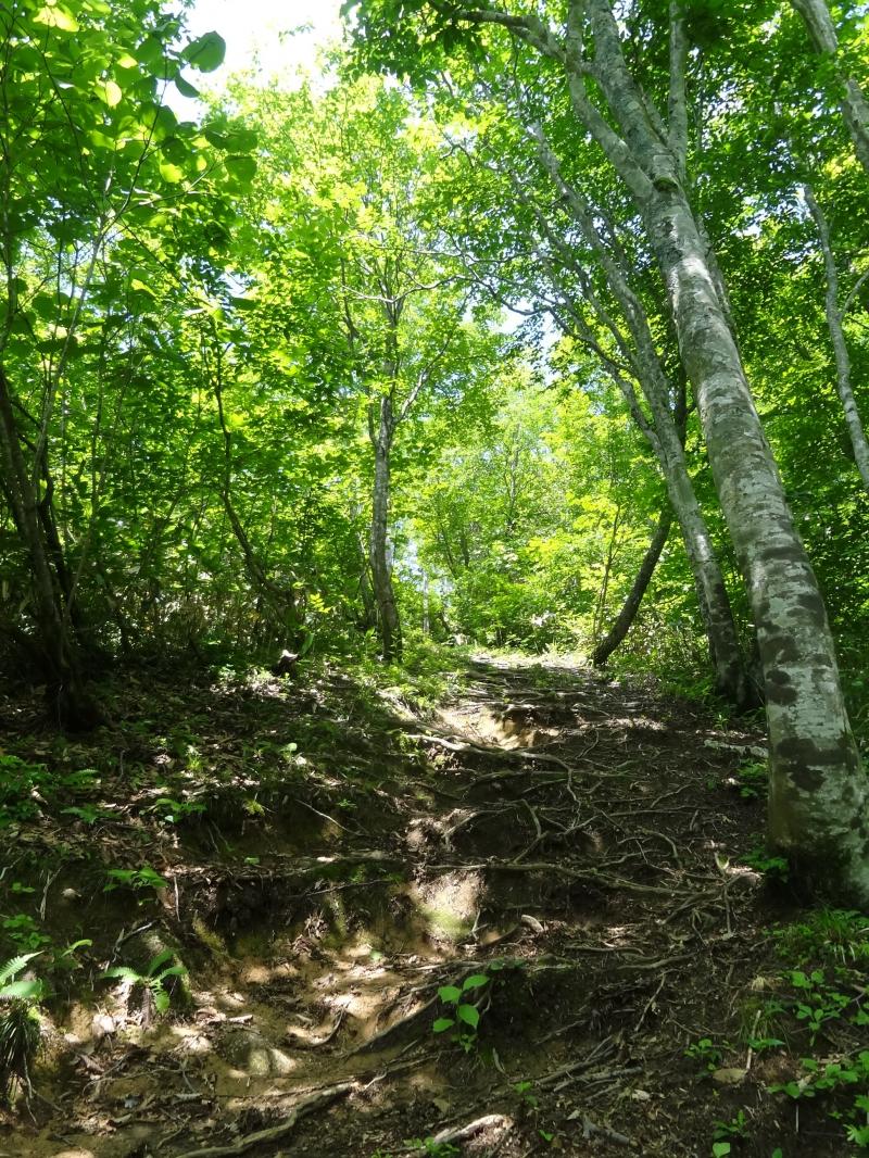 キャンプ場奥から続く沢沿いの道は樹林帯で昨日の山とはまた違う白樺の木があり、さらに涼しい。沢沿いから離れて尾根道になると急坂という看板があり、ひたすら登る。中間点から先の方が本気で急坂で汗がにじみます。終点の雀平は台地が広がり、ひと呼吸。目の前の山頂らしきこんもりした山までまたひと登りで再び、急坂になります。ファミリー向けにはこの急坂がきついかもしれません。