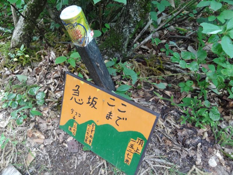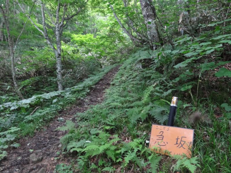⑤標高1150mあたりで尾根上りに変わり、急坂の看板とともに雀平まで続く