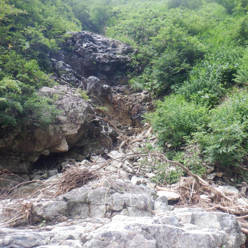 汗だく土まみれになりながら、何とか降りられそうなところの上まで進み、最後は強引な滑り台下降でやっと沢へ戻ることができました。