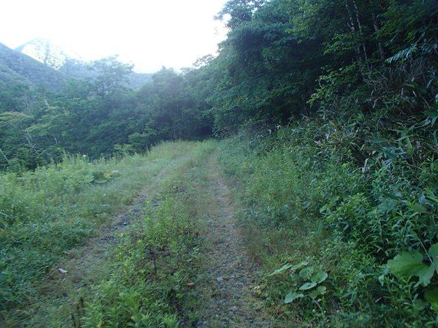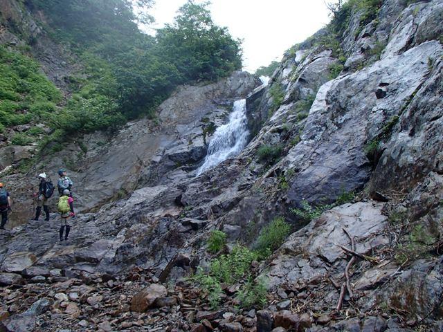 連日暑い日が続いていますが、この日に限って予報は雨。台風の影響のようで登山口は雨が降っていませんが、稜線付近は厚い雨雲が被っています。予定より早めに楽古岳山荘を通過し、そのまま林道をたどって沢に降り立ちます。前半は所々に小さな滝があるだけで荒れた川原歩き。600m付近でやや大きめの滝を左岸から巻き終えるあたりからゴルジュ地形となり、770mには正面に大きな滝が懸かっています。このあたりから雨は断続的に強くなり始めましたが、気温が高いのでむしろちょうど良いくらいでした。