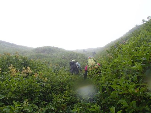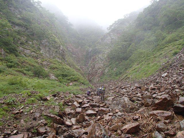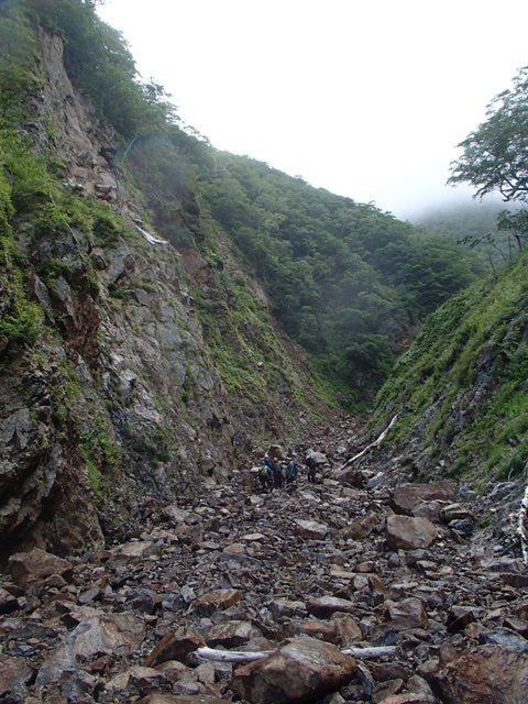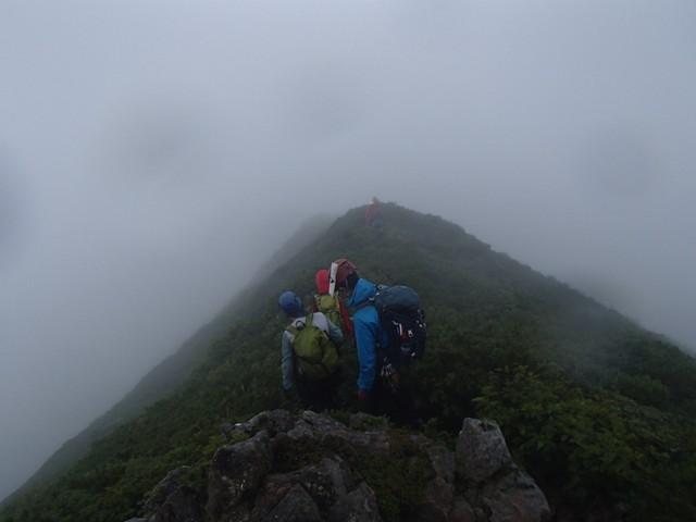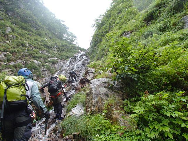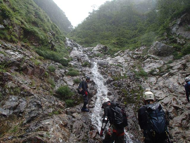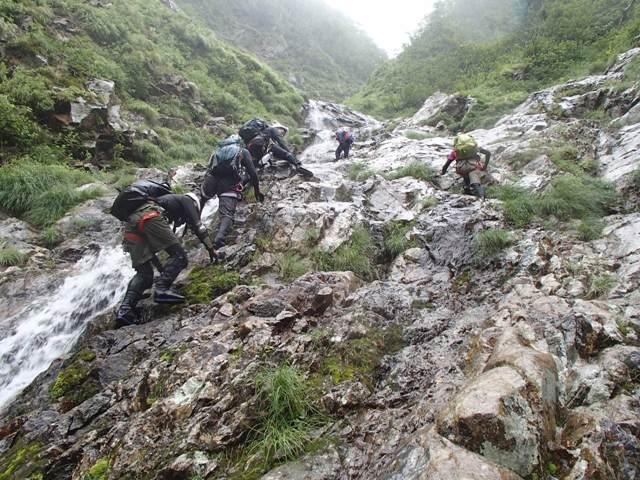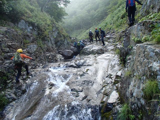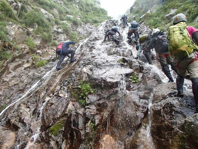 ここから傾斜が強くなり滑滝がググッと稜線近くまで一気に続き楽しい核心部です。ホールドやスタンスはいっぱいあるのでロープを出すような難しいところはなく快適に直登出来るので非常に楽しいです。皆もワイワイとルートを探し思い思いに登って行くと、最後は藪漕ぎもほぼなく、稜線に出ました。稜線上には夏道が有り、頂上まではすぐでした。頂上に着く頃には雨が本降りになってきて、周りはガスガスで展望もなし。下りは夏道で楽に帰れました。