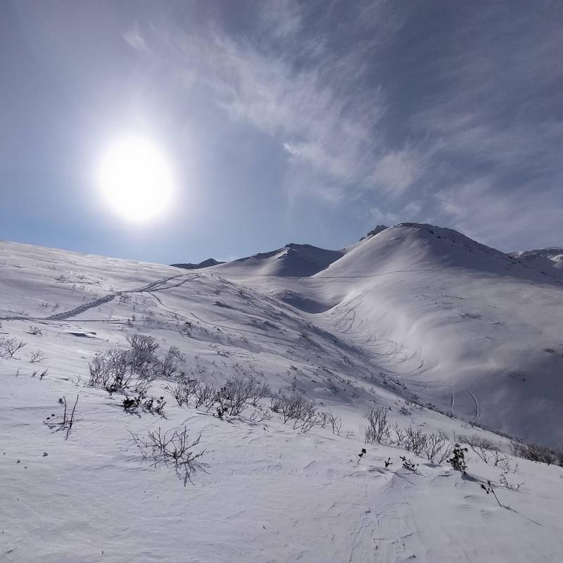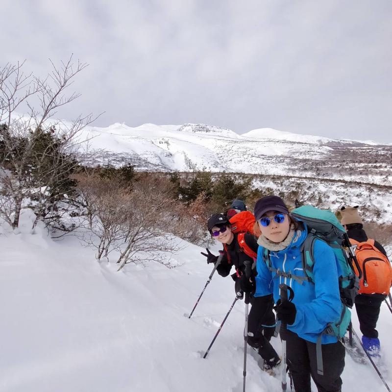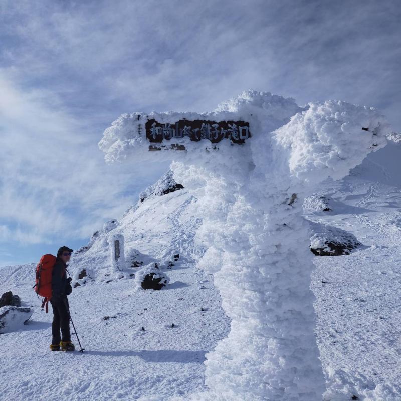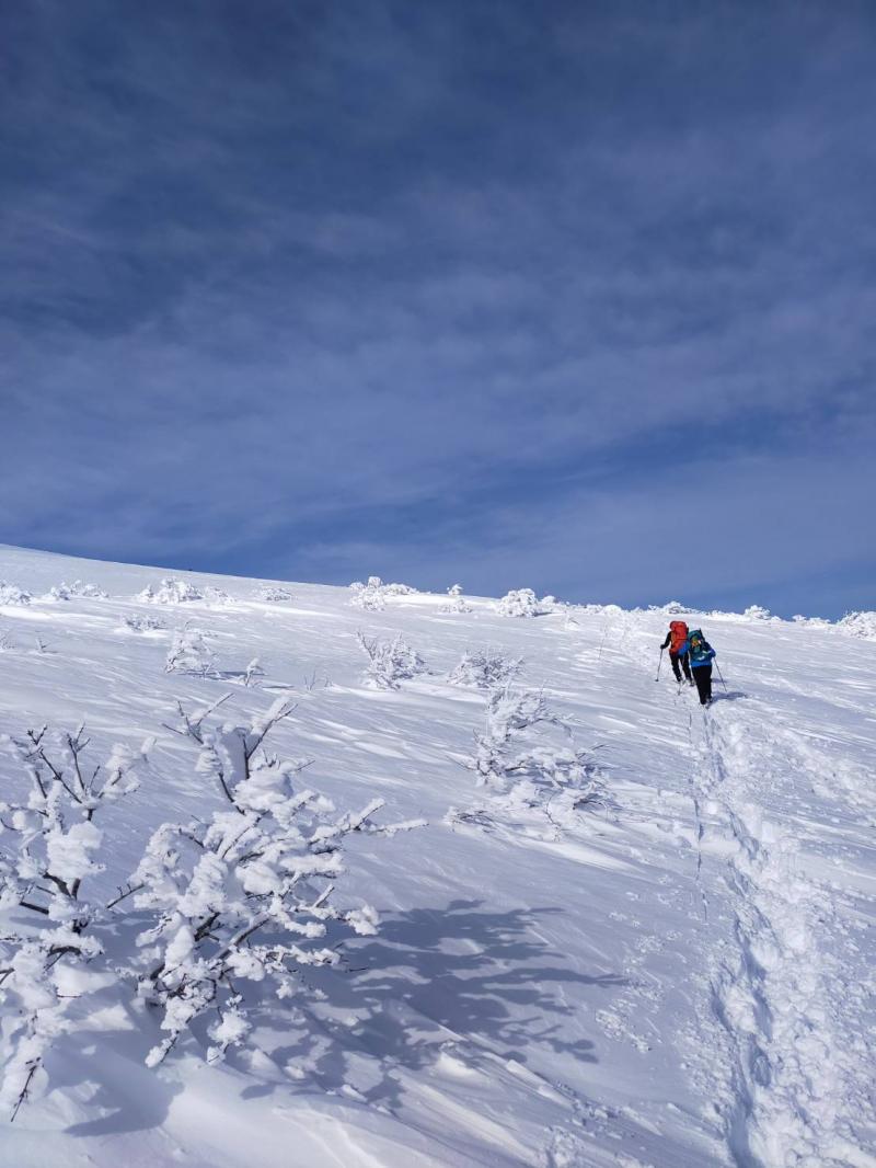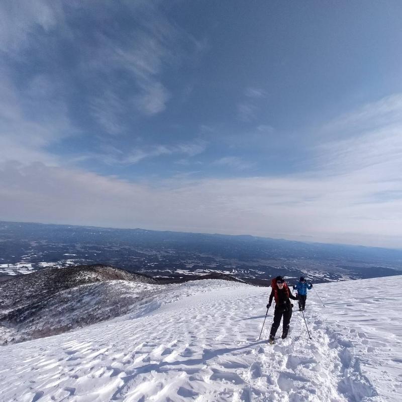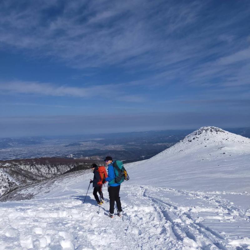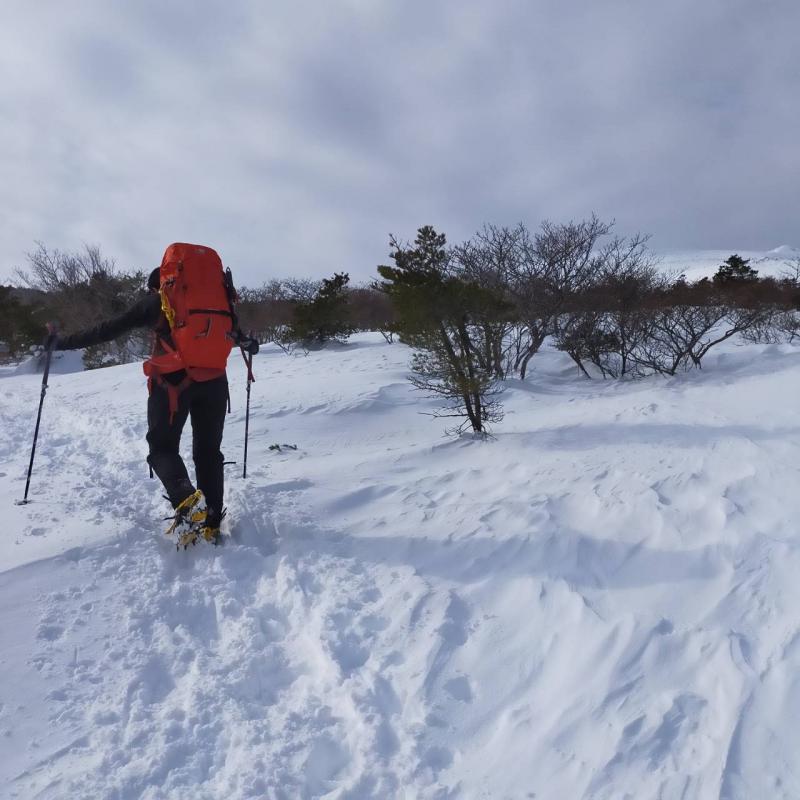 - ・トレースがばっちりついていて12本アイゼン・ストックで登りました。わかん・スノーシューの方も多かったです。自分はわかん持参で使わず、友人はスノーシューで登りました。頂上付近だけピッケル出しましたがストックでも大丈夫そうでした。
