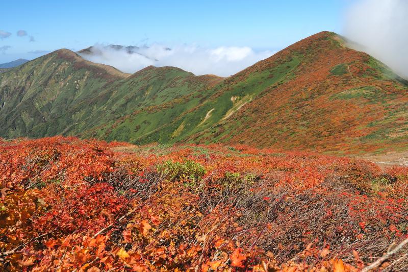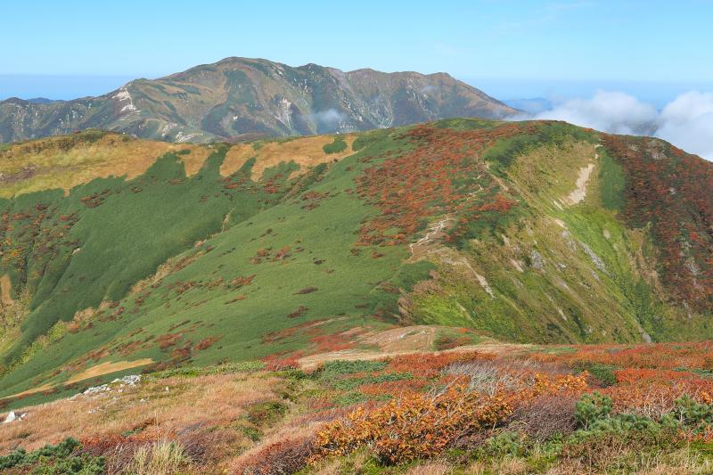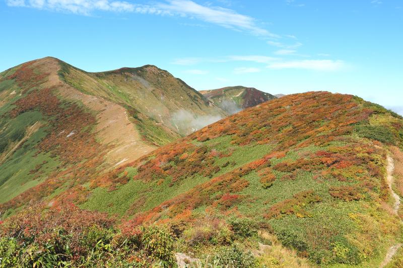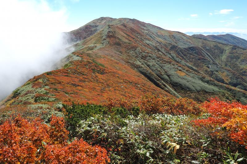 竜門山に戻って次は西朝日岳へ。西朝日岳へ向かう南西斜面も一面の紅葉です!登りと太陽がジリジリと日焼けで体力消耗します。西朝日岳まで来ると大朝日岳が目の前に大きく現れました。一旦下ってなかなかに登り返しますね〜。中岳手前の紅葉も素晴らしい♫ハクサンイチゲがちらほら咲いていましたが、季節を間違えて咲いているのかな?中岳は巻いて大朝日小屋へ。地味に大朝日小屋手前の登りがしんどかったです。