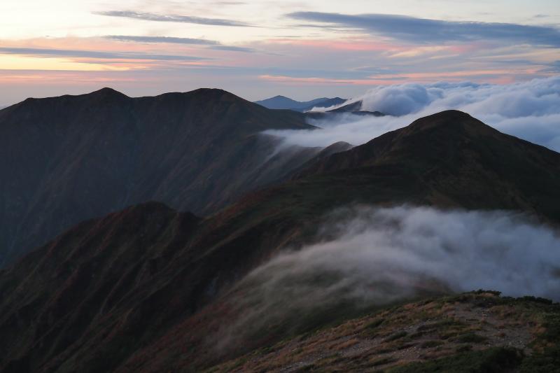 小屋に戻って朝ご飯食べて小朝日岳を経由して日暮沢小屋へ下山です。一旦下って銀玉水で軽く水を補給して、小朝日岳へまた登り返し。ここがなかなかきつい。名残惜しく何度も振り返りました。古寺山までは割と展望の良い登山道。その先は樹林帯に入ります。