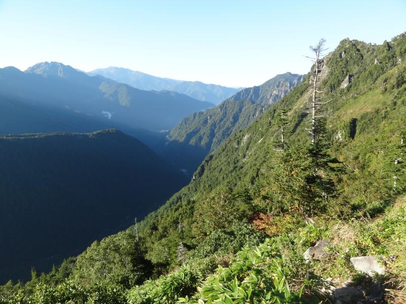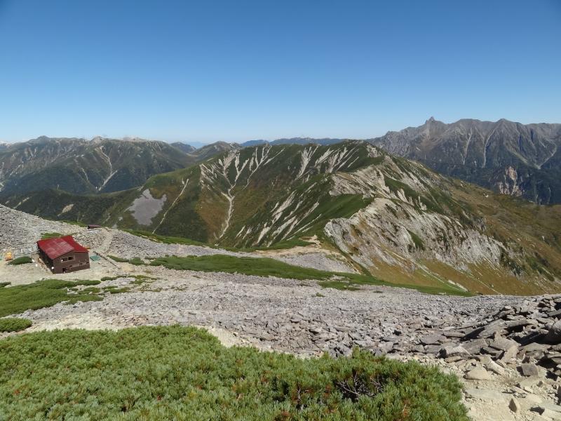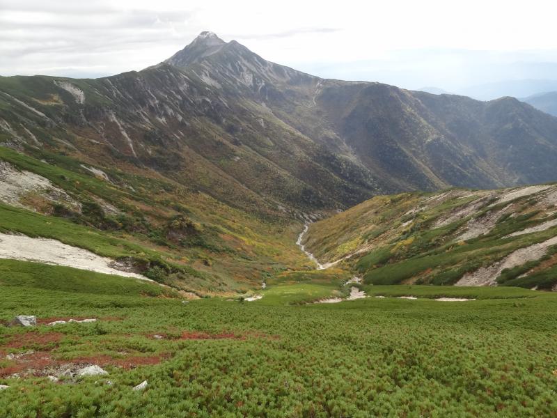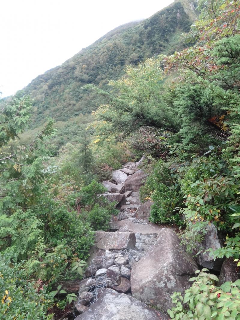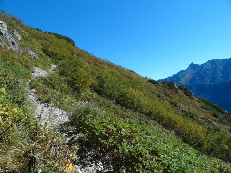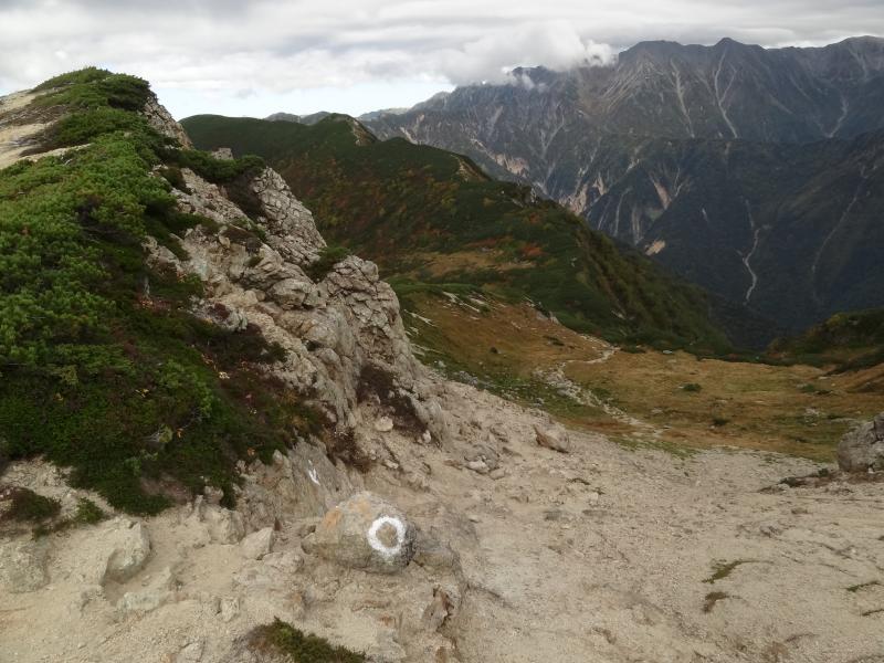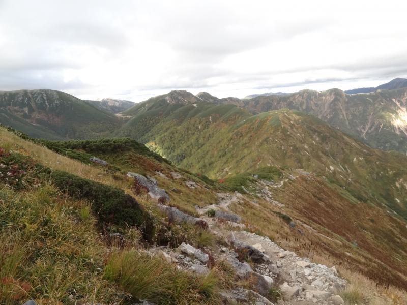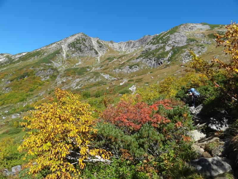 入口から1400mもあがらないといけないこの登山道、最近の夏場だったら大バテしそうな長さですが、しんどさは不思議に感じませんでした。でも長い、長い、同じようなとこをずっと登っている感じで、特に上り詰めた杓子平からまだまだ長い稜線への道はこたえます。それでもわざわざ笠周りにしたのは紅葉が始まった杓子平から見るこの景色を見る為。本当にご褒美と思える絶景です。夏場はお花畑が広がり、また美しい風景が広がるのでしょう。