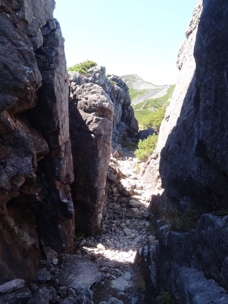 ⑥分岐から笠ヶ岳山荘までのピストンは結構遠い印象で、行きの方がかかります。途中の抜戸岩の間を通過していくのが印象的です