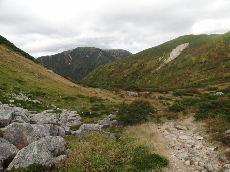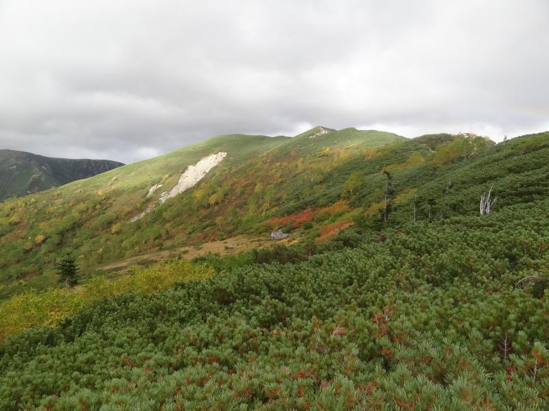 ⑪笠新道分岐~秩父岩まではゆるい稜線漫歩ですが、秩父平に下降するのは結構下がります。その先は結構登って行きますが、下部はハイマツのトンネルです。紅葉はこの秩父平から先の稜線が綺麗です