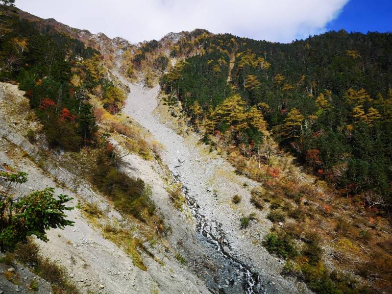 大門沢小屋まではガレ、ザレの急登、気の抜けない道をひたすら下降します。枯沢を2度ほど渡り整然としたカラマツ樹林帯を過ぎるとようやく大門沢小屋。賞味期限の切れたリンゴジュースを割引してもらい、一気に流し込みました。ダイナミックなトイレも体験し身支度を整えたら、後半戦に突入です。