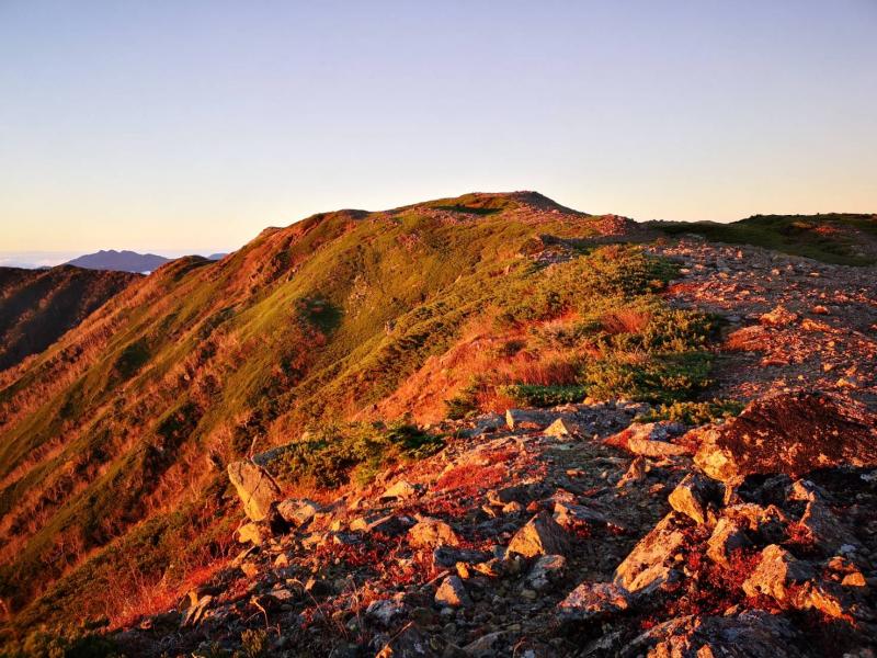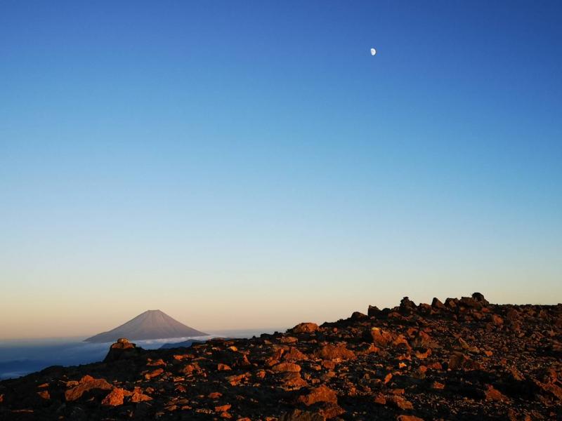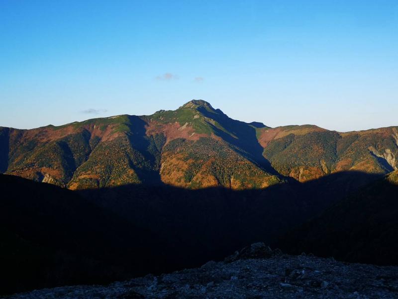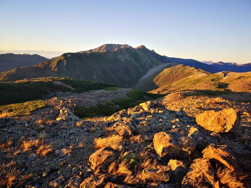 気を取り直して再び稜線歩き。ゴーロ帯をよじ登り白河内岳を目指します。午後の日差しに染まる塩見岳を見ながらだだっ広い山頂を歩き、この日のビバーク地に着きました。アーベントロートの農鳥岳と、徐々に青からピンク色に染まる富士山を眺めながら贅沢なサンセットを堪能し、我が家に潜り込みました。