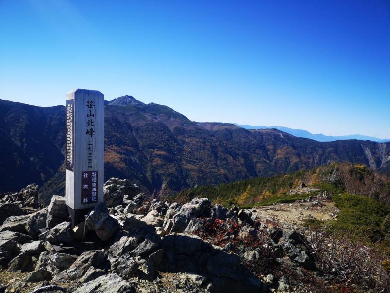 笹山までは単調な樹林帯時々急登、鹿の鳴き声をBGMに黙々と登ります。途中でバテないようペースはゆっくりと、水はこまめに摂り、休憩も適度に挟みました。延々と続く登りに飽きてきた頃、ようやく北側が開けて、これから歩く稜線から北岳、農鳥岳が顔を出していました。北岳のシルエットはなだらかな三角形と記憶していたので、槍のように尖った姿を見て日本第二の高峰の貫禄を感じました。