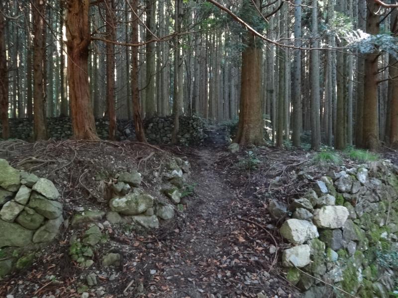 ④京極黄和田城の石垣付近に中電保守道の黄色看板を入ります