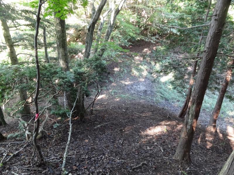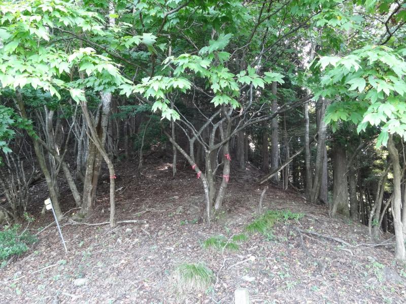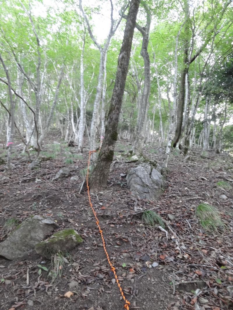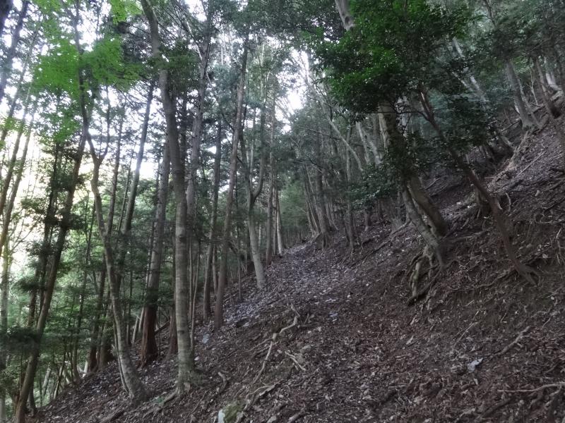 名前からして急峻をイメージしますが、道の駅から見る限りでは岩場が切り立ったような山ではありません。しかし案内などは全くないので登山口も地図とにらめっこしながら行かないとわかりません。登山口らしき祠から踏み跡が続く道をたどると、城跡の石垣があり、このあたりから続く中電の保守道を辿っていきます。送電線177号まではすんなりですが、この先のピークまでの直登ルートはまさに急坂で上りはまだしも下りは無理じゃないかというほど傾斜が強いツルツルの道で残置ロープもあります。なんとか登りつめると傾斜も落ち、稜線にでて、マーキングの従い進むと、展望もないピークに到着します。一生懸命登ってもこのピークだとがっかりかもしれません。ので先に進んで展望が効く送電線178まで進みました。この先は旭山や東山といったピークがあり、登山道もしっかりしているようですが、今日はここまで。岳のピークを迂回するトラバース道で戻り、元の登山道へ合流し、下りました。